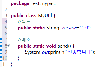 static 예약어를 사용하면 추후에 해당 메소드를 호출하거나 필드를 참조할때 new를 사용하지 않고 .을 찍고 바로 사용할 수 있다.
