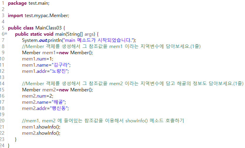Memver.java에서 작성해 놓은 showInfo() 메소드를 MainClass.java에서 호출했다.