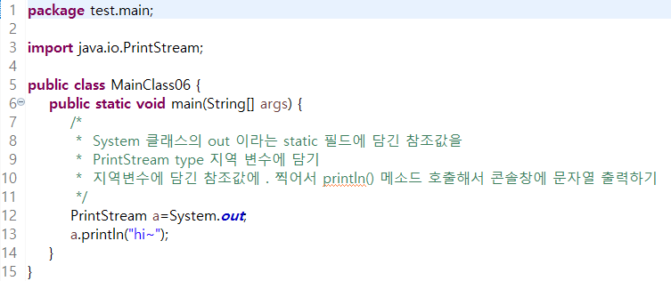 앞서 MainClass04를 공부할때 사이트를 참고해서 알 수 있듯이 콘솔창에 출력해주는 역할을 하는 System.out은 PrintStream type이다. 따라서 해당부분을 지역변수에 담아 사용하는 것도 가능하다.