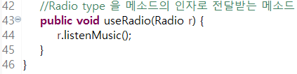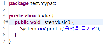 useRadio예제에 초점을 맞춰서 보면 될 것 같다. 공부하기 위해서 Radio.java가 public이 아니라는 가정하에 여러 클래스를 연결시켜 예제를 풀었다.