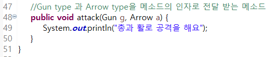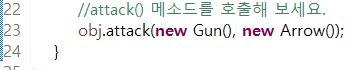 사진을 첨부하지는 않았지만 Gun.java, Arrow.java class가 존재한다. 두가지 인자를 전달할때는 ,로 구분하여 전달하면 된다.