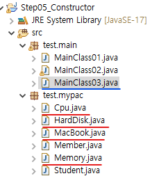 MainClass03, MacBook, Cpu, HardDisk,Memory (private를 사용한 클래스를 연결하기)