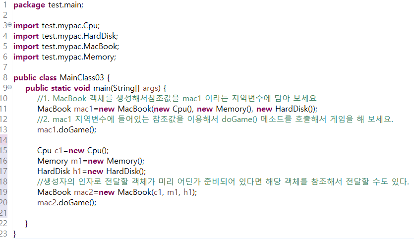 생성자를 사용해서 해당 클래스의 필요한 준비작업을 작성했다. 이후 메소드에서 cpu, memory, hardDisk가 한개라도 null일 경우면 메소드를 종료하고 만약 3개 다 존재한다면 "신나게 게임을 해요!"가 출력되도록 작성했다.