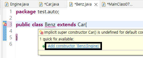 Benz에서 Car을 상속 받으려고 하자 오류가 난다. 이때 해당 버튼을 클릭해 생성자가 생성되도록 한다.