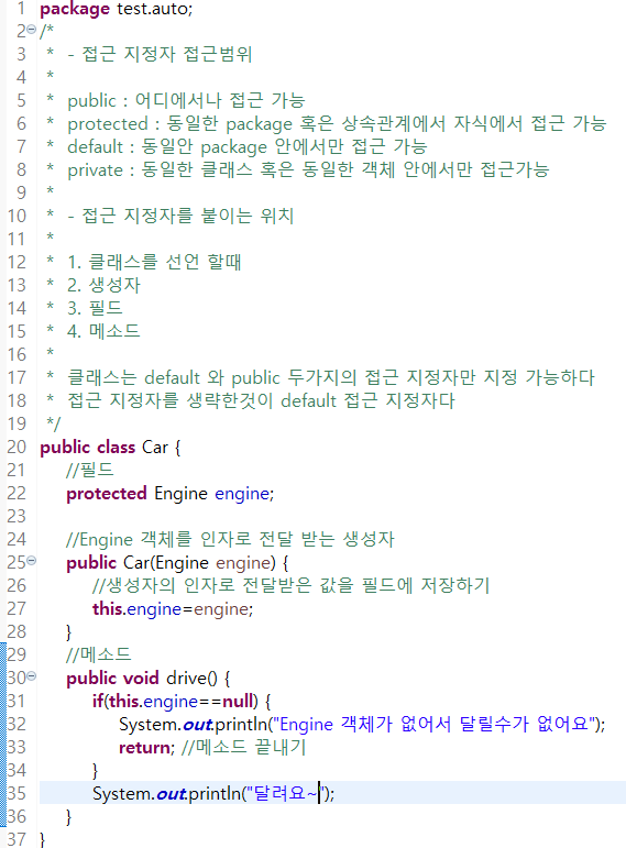 생성자는 Engine 객체를 인자로 전달받도록 작성했다.