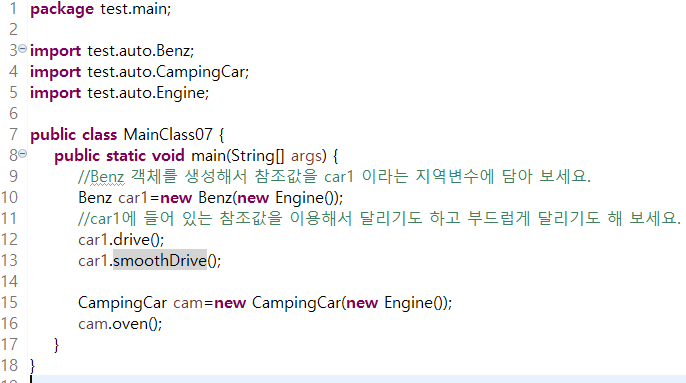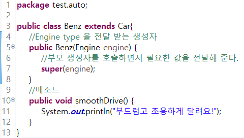 Car class와 Benz class를 작성할때 봐서 추측할 수 있듯이 MainClass07에서 Benz 객체를 생성할때도 Engine type을 인자로 넣어줘야한다. 이후 만든 car1변수를 활용해 메소드를 작성했다.