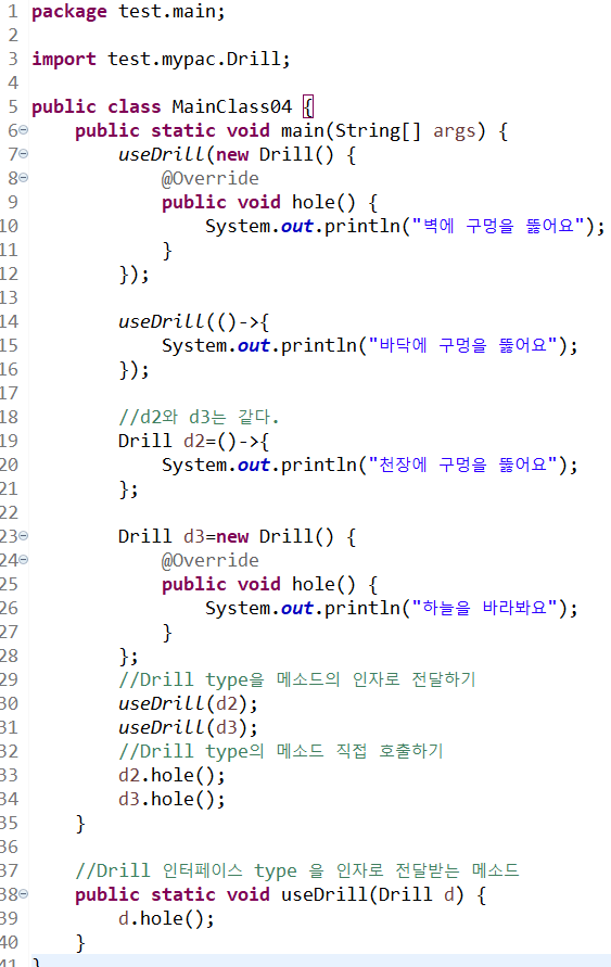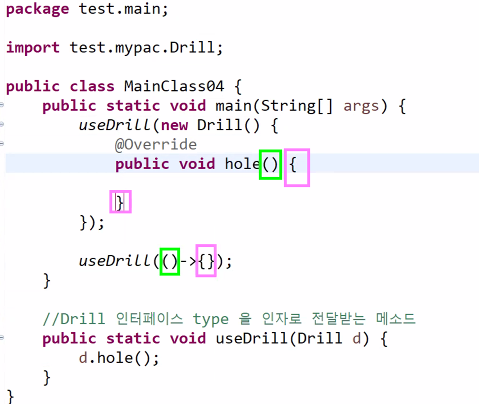 해당 코드와 같이 메소드의 인자로 전달하여 useDrill 메소드를 실행하여 hole 메소드를 실행하는 방법이 있으며