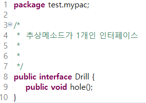 새로운 메소드 표현식을 소개하기에 앞서 추상메소드가 1개인 인터페이스 Drill을 작성했다.