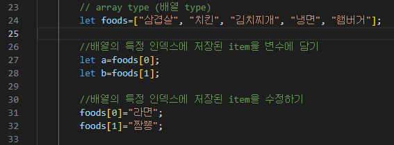 array type도 변수를 특정 배열에 활용하거나 수정이 가능하다.