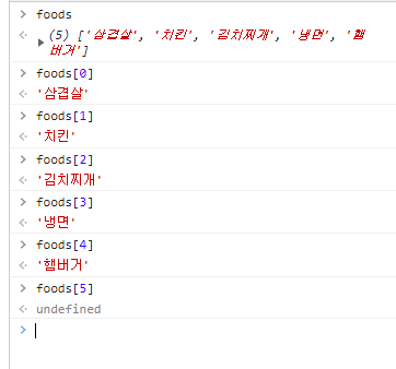반면에 순서가 중요한 상황에서는 array type을 사용하고 let key=[value1, value2] 형식을 사용한다. array type은 1이 아닌 0부터 시작하고 undefined는 5번째 데이터는 저장해놓지 않아서 그렇다.