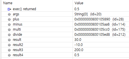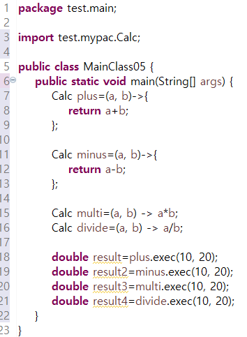 @FunctionalInterface를 활용해서 만들어진 Calc interface를 가져와 코드로 작성한 예시이다. 람다 함수 표현식이 잘 작성되는 것을 알 수 있다. 여기서 plus와 minus 변수를 만들며 작성한 코드가 일반적인 형태인데 return만 사용하고 있다. 이렇게 람다 함수식에서 return만 활용할때 multi, divide 변수를 작성한 코드와 같이 {}와 return을 생략하는 것이 가능하다.