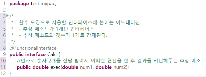함수 모양으로 사용할 인터페이스에 붙이는 어노테이션이다. 굳이 @FunctionalInterface, interface 형식을 사용하지 않고도 추상 메소드를 1개만 사용하는 class 혹은 interface는 람다 함수식을 사용할 수 있다. 그럼에도 @FunctionalInterface 를 사용하는 이유는 신뢰성을 높이기 위해서다. @FunctionalInterface를 사용하고 interface를 만들때 추상메소드를 두개 이상 작성하면 애초에 컴파일이 안된다.