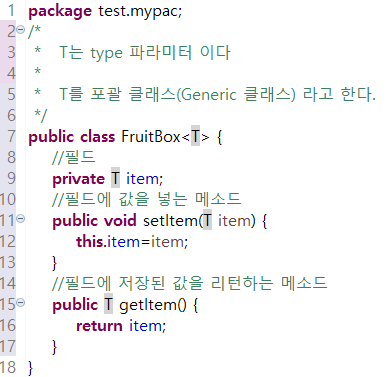 포괄클래스를 만들고 setter getter 메소드를 추가하였다. 이때 type을 T로 지정해서 추후에 가변 가능하게 만들었다.