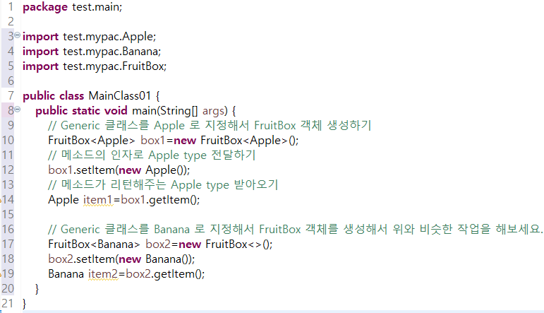 포괄클래스인 FruitBox를 활용해서 변수를 만들거나 setter getter 메소드를 활용한 예시이다.