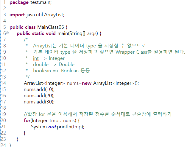 이후 Mainclass04에서 학습한 확장 for 문을 사용해서 정수를 콘솔창에 출력하였다.