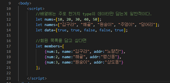 배열은 주로 한가지 type의 데이터만 담는 것이 일반적이고 안에 object type을 삽입할 수 있다.
