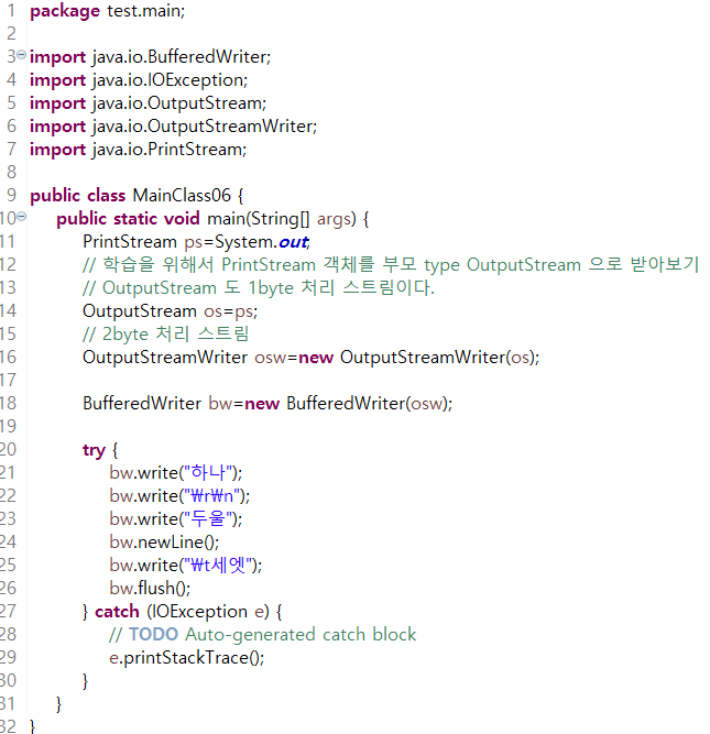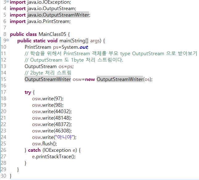 OutputStreamWriter은 2byte 처리 스트림이다. 예시에서와 같이 1byte 혹은 문자열도 출력 가능하다.