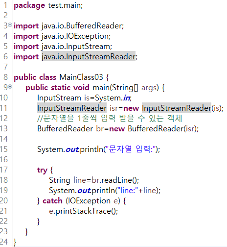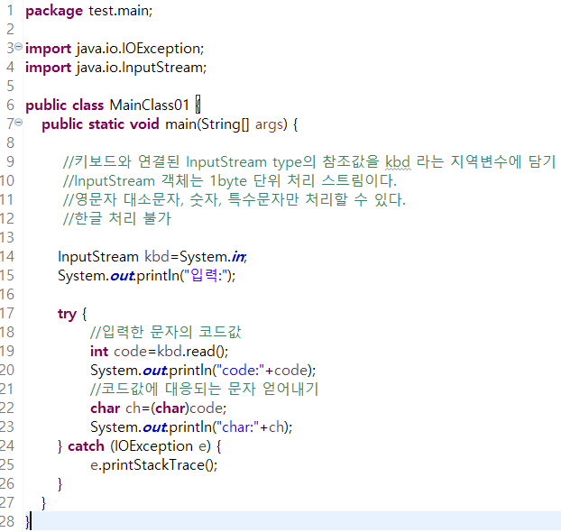 키보드와 연결된 InputStream type의 참조값을 kbd 라는 지역변수에 담아 사용했다.