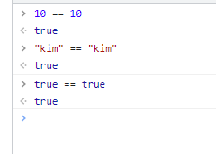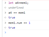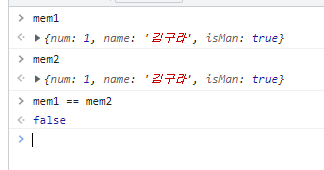 let을 활용하여 임의의 변수명을 mem1과 동일하게 만들어서 둘 다 object type 임에도 == 값을 true로 만드는 것이 가능하다. 또한 mem1.num == 1 예시를 보면 출력 값이 number, string, boolean type인 경우에는 true 결과를 가져올 수 있다. (예시에서 mem1.num의 출력값은 number type이며 1이다.)