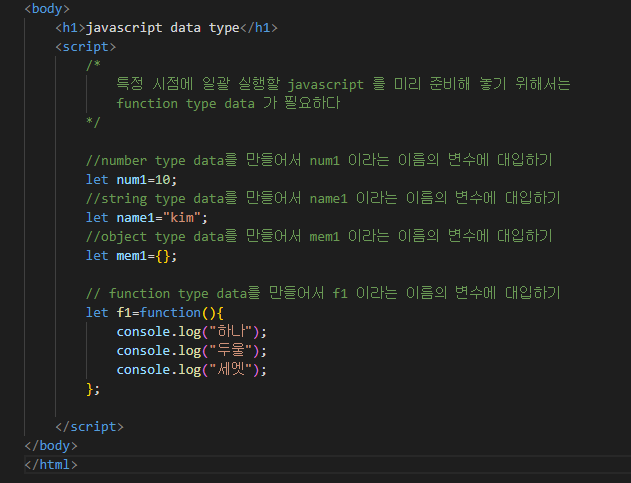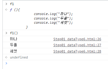 function type은 data를 준비해놓아야할 경우 사용한다. function type은 function(){} 형식으로 작성한다. 기존에 배웠던 console.log() (페이지 로딩시에 결과 값을 출력시켜 주는 함수) 를 활용하여 f1이라는 함수를 만들어봤다..