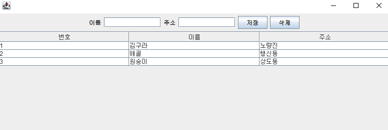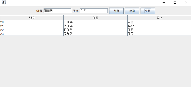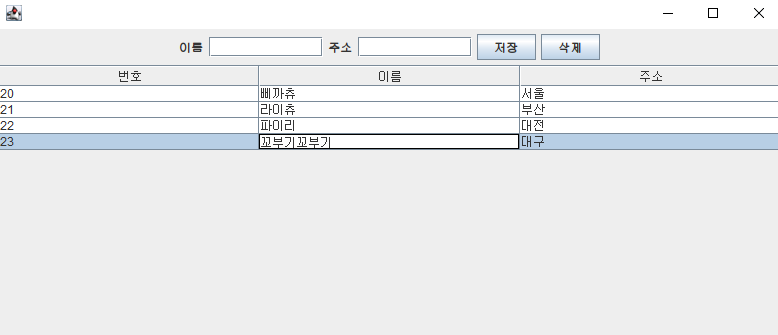 기존에는 행을 선택하고 이름과 주소를 JTextField에 각각 입력 후 수정 버튼을 넣어 기능을 동작하였다.