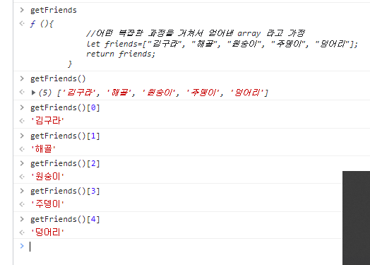 예시에서 getData() 는 object type 형식으로, getFriends()는 array type으로 입력해놓았기 때문에 abject type, array type 활용하는 것과 같이 사용이 가능하다. 위 사진은 그 예시이다.