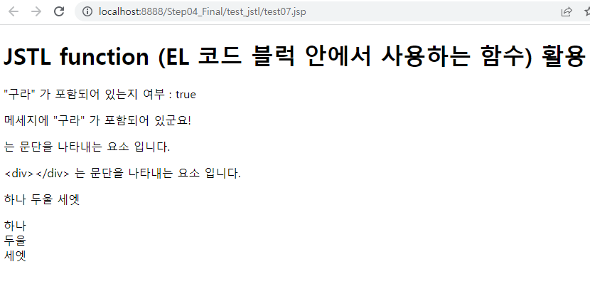 <p> "구라" 가 포함되어 있는지 여부 : ${fn:contains(msg, '구라')}</p>