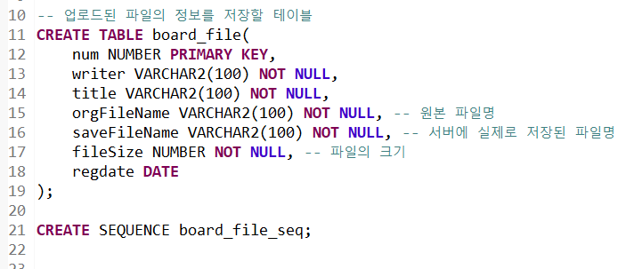 파일 업로드 게시판은 아래의 sql에 기반하여 사용된다.