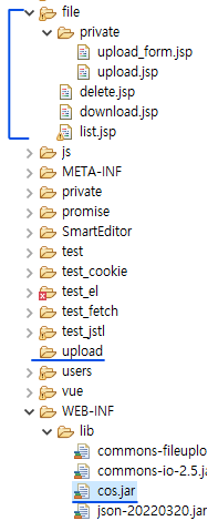 파일 업로드 처리를 하기 위해서는 MultipartRequest 객체를 이용해야 한다.(cos.jar에서 import한 것)