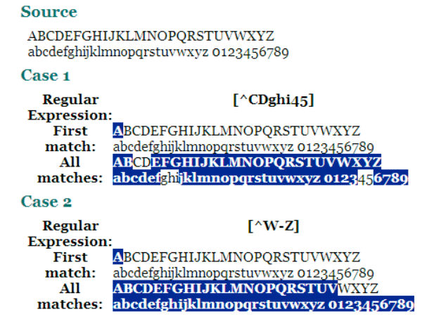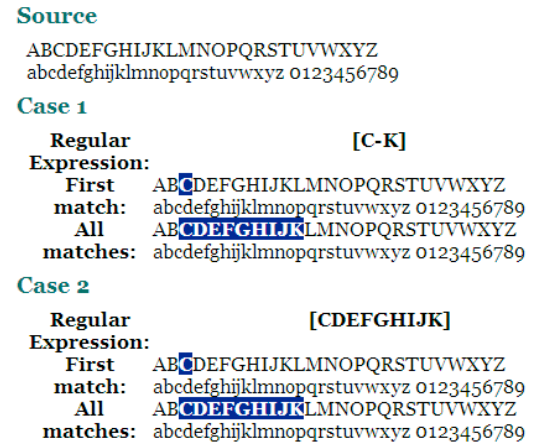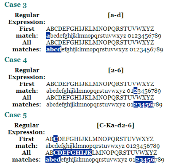 문자의 범위는 [ - ] 문법으로 나타낼수 있다. 여러가지 범위도 Case 5 처럼 하나의 표현식으로 쓸수있다.