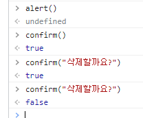 alert 빌트인 함수는 기존에 배웠듯이 팝업창을 실행시켜주는 빌트인 함수이다. confirm이라는 모양새가 비슷한 빌트인 함수도 존재하는데 가장 큰 차이는 취소버튼이 추가된 것과 출력값이 boolean type으로 출력되는 것이다.
