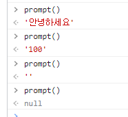 prompt라는 빌트인 함수도 존재한다. 사용자로부터 입력값을 받아 문자열로 출력해준다. 숫자도 문자열로 입력되는 것을 확인할 수 있다. 확인만 눌러도 공란의 문자열이 출력되고 취소를 누르면 null이 출력된다.
