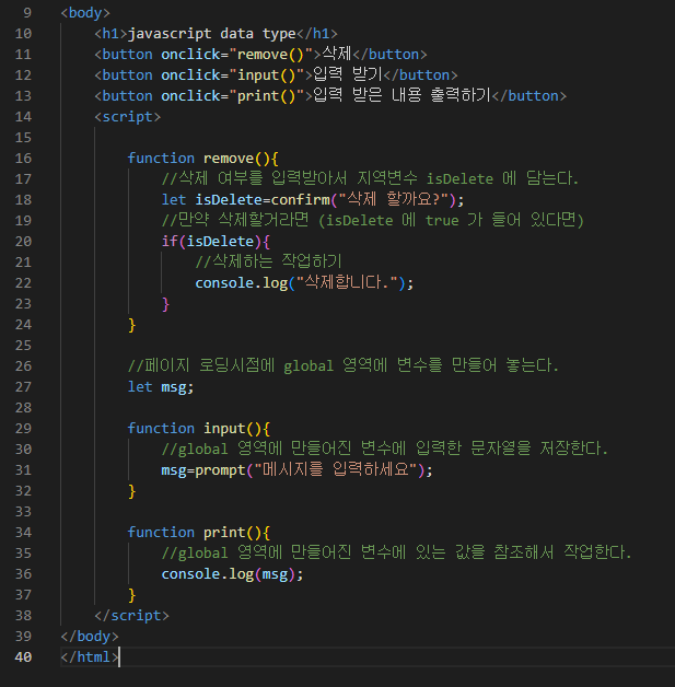 이후 if 함수를 활용하여 isDelete 함수가 true로 나올시 "삭제합니다"가 기록되는 기능을 추가하였다. false일 경우 넘어간다. console 기능, break point, scope 기능을 활용하여 작동과정을 확인할 수 있다.