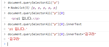 접근을 완료한 뒤에는 변경을 해본다. 필자는 "김구라", 1, document.querySelectorAll("p")[1].innerText를 시도해봤다.