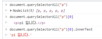 이후 출력되는 값이 p태그 이기 때문에 object type 뒤에 작성하는 .을 입력하고 innerText를 통해 해당 string type 문자를 출력한다.