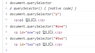 해당 모든 데이터를 array type으로 출력해주는 querySelectorALL과 다르게 querySelector는 첫번째에 있는 한개의 데이터만 출력해준다.