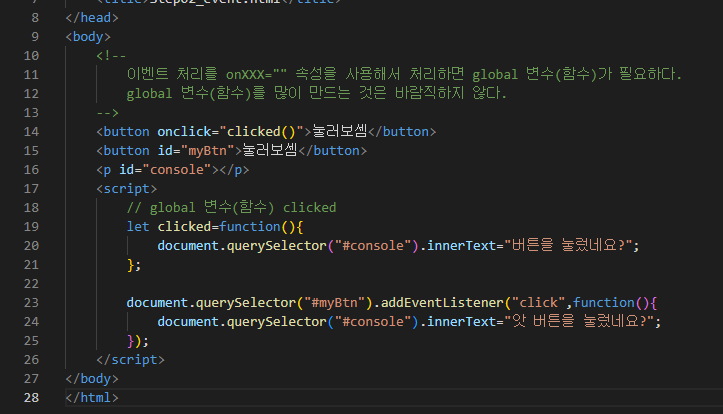 그동안 onclick을 활용하여 일련의 javascript를 동작하게 했었다. 이는 script glabal area에 함수를 만들게끔 강제되는 것으로 global area에 함수가 많아지면 여러 단점이 존재하기에 addEventListener 함수를 사용하여 새로운 코드를 작성해보자.