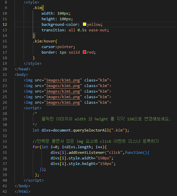 for 반복문을 활용하여 클릭한 이미지만 확대되게 만들었다. 변수명.length를 사용하여 img가 늘어나도 javascript를 수정할 필요 없게 작성하였다. 이후 transition을 사용하여 부드럽게 동작하도록 만들었다.