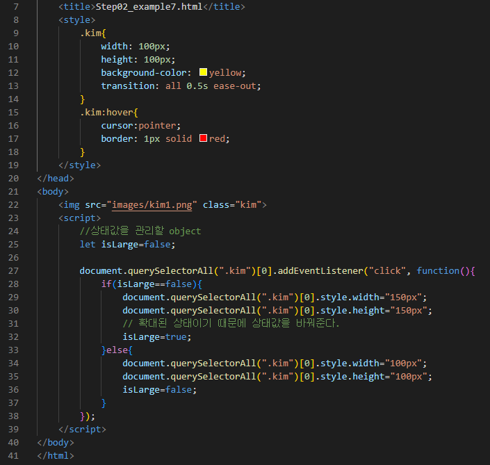 해당 예제는 Step03_example6에서 이미지를 클릭시 크기를 키우는 코드만 작성했다면 이번에는 재클릭시 작아지게 작성했다. if 문에 기능을 더한 if else를 사용했다.