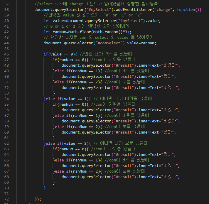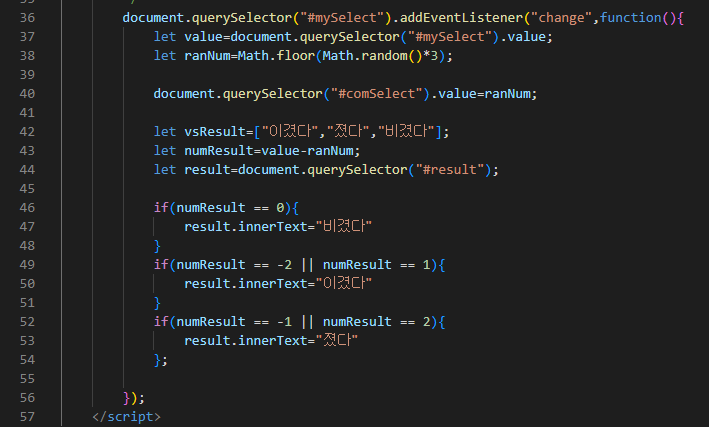 사용자의 value값에서 컴퓨터의 value값을 뺀 다음, 각 승부별로 나오는 값의 특징을 활용하여 if문을 구성했다.