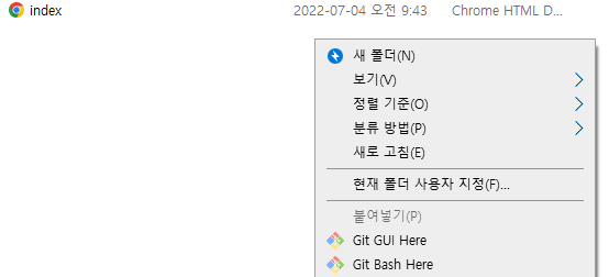 폴더에 html 파일을 만든 후 Git Bash Here을 클릭한다.