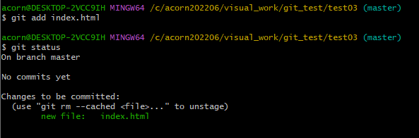 index.html을 add하고 git status로 확인하면 commit 되지 않았고 add한 항목을 unstage하려면 "git rm --cached <file>..."을 타이핑 하라고 나온다.