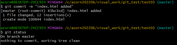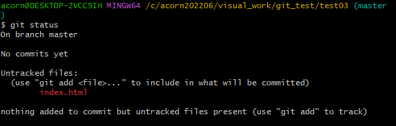 commit하지 않은 index.html 파일이 생긴 것을 git이 인식한다.