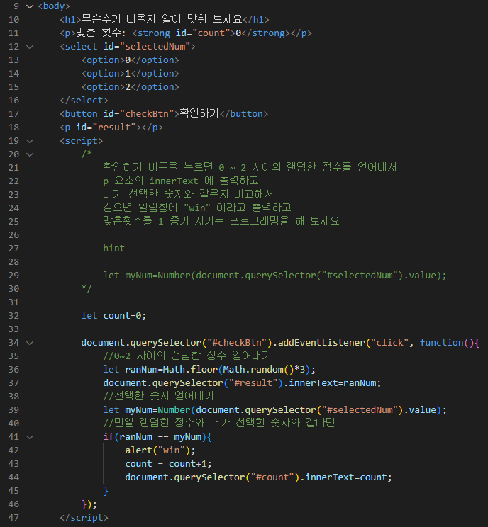 Step02_example9에서 배웠던 랜덤한 정수를 출력해주는 floor(Math.random()*숫자)를 사용하여 숫자 맞추는 게임을 만들었다.