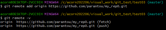 저장소를 만들면 나오는 추천 명령어 중에 git remote add origin https:github.com으로 시작하는 명렁어를 git에 입력해주는 것이 중요하다. 로컬에 원격저장소 위치를 입력하는 것이다. 그 명령어를 복사해서 git에 입력해주고 git remote -v 명령어로 잘 적용되었는지 확인한다.