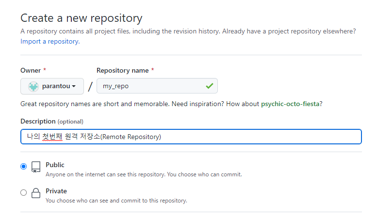 git hub를 가입한 후 우측상단을 보면 New repository 기능이 있다.