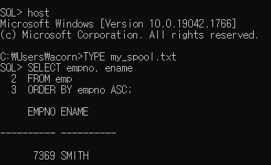 HOST로 오라클을 빠져나와서 TYPE을 사용해 직전에 저장한 my_spool.txt 파일을 열어본 상황이다.