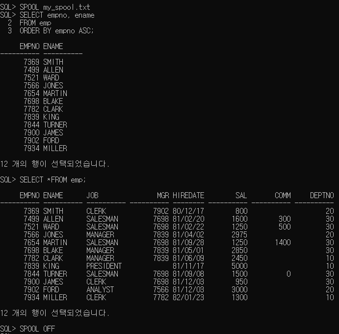 SPOOL, SPOOL OFF를 사용해서 내용을 파일로 저장할 수 있다.