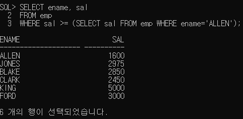'ALLEN' 의 급여와 동일하거나 더 많이 받는 사원의 이름과 급여를 출력해 보세요.