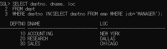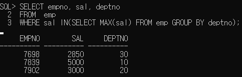 다중행 서브쿼리의 결과값을 조건절에서 사용할때는 반드시 다중행 연산자와 함께 사용해야한다. ( IN, ALL, ANY, EXIST)